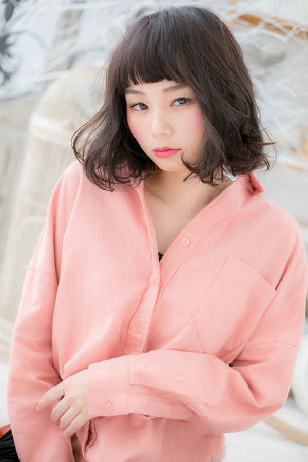 ショートバングとくせ毛風のゆるパーマでカジュアルに仕上げたふわミディ。黒髪でも重めヘアスタイルにならず、ラブガーリーな印象にへアレンジもOK。大人女子のコーデも完成!ナチュラルボブや大人ボブ、フェミニンボブや前下がりボブからの伸ばしかけにオススメ。ミディヘアを際立たせるグラーデションでトリートメントしたようなカラーリングもおすすめ!30代・40代にも◎