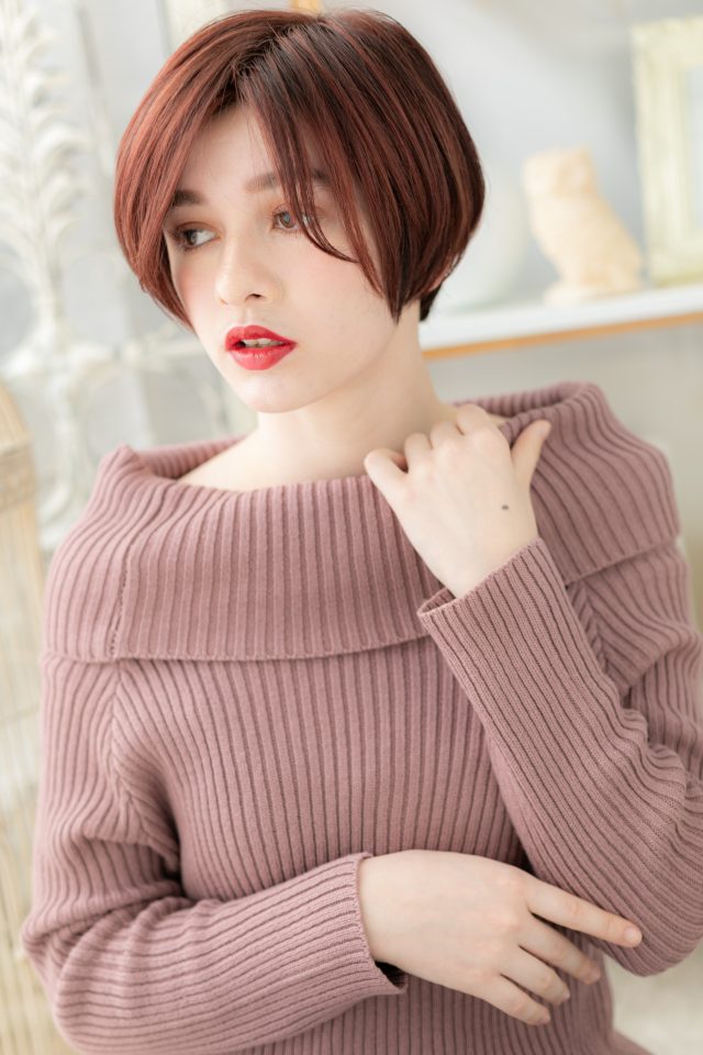 前下がりで小顔に見せたシンプルなナチュラルボブは外国人風ボルドーやレッド系カラー、人気のカラー髪の毛の悩みも解決。周囲と差を付けた格上げ大人ボブは耳かけでアシンメトリーヘアアレンジ大人女子のファッション度UP。(メイク担当:COVERHAIRGROUP棟方)