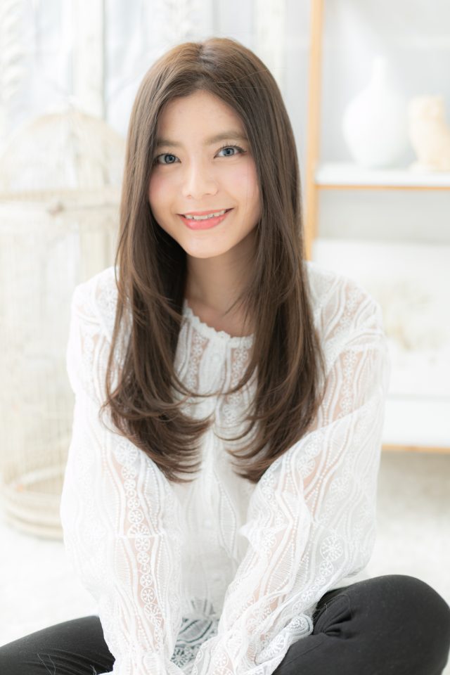 無造作かき上げバングでラフ&リラクシーに仕上げたワンカールロング。重めスタイルでも、ツヤ感レイヤーで軽くやわらかな印象に。くせ毛風カールを付けたりふわミディからの伸ばしかけにもGOOD。耳かけも大人かわいい。