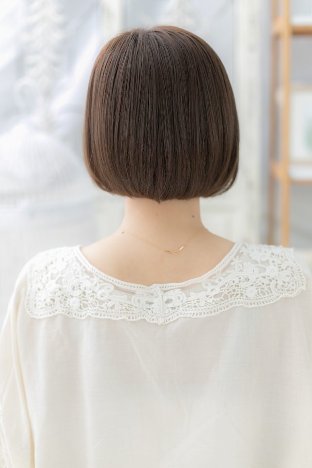輪郭をカバーして小顔見せ効果を狙った前下がりボブ。シースルーバングで透け感を出して大人かわいい雰囲気に。ナチュラルボブやフェミニンボブ、大人ボブやふわミディなどイメチェンも◎(メイク担当:川口店成田)