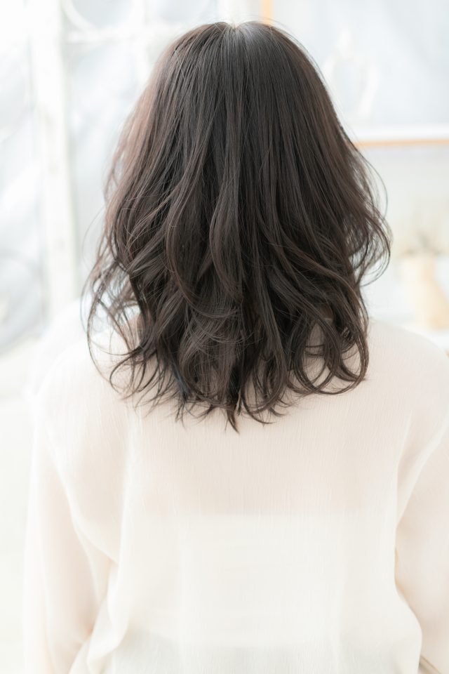 黒髪ダークアッシュくせ毛風鎖骨ミディアム