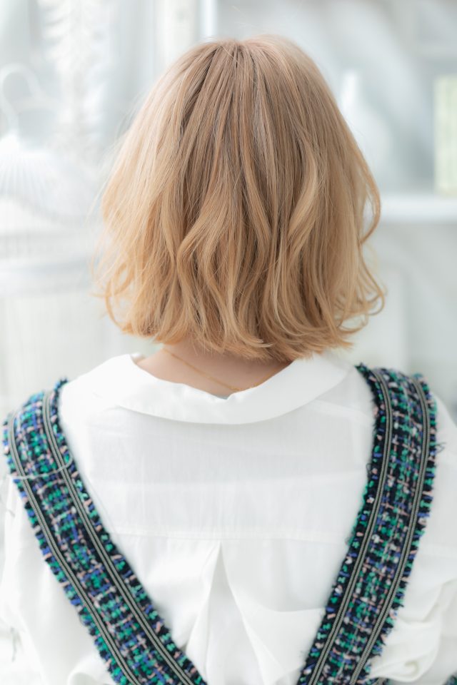 くせ毛風ゆるふわミディはハイトーンカラーで甘辛ミックスに。耳かけや小顔前下がりも大人かわいい。ナチュラルボブやフェミニンボブ、大人ボブや前下がりボブからの伸ばしかけに◎斜めバングや厚めバングで目力強調。
