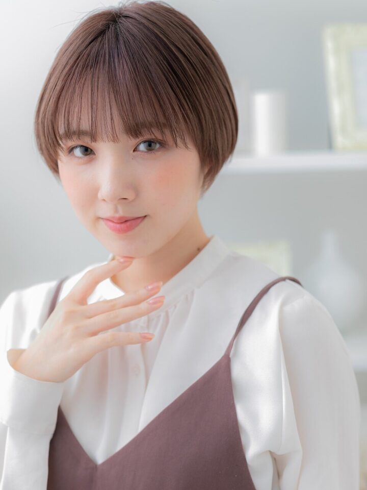 斜めバング厚めバングシースルーバングが大人かわいい。くせ毛風ゆるふわミディや耳かけ前下がりウルフで小顔。ナチュラルボブフェミニンボブ,大人ボブ前下がりボブ,切りっぱなしボブも人気。(メイク担当:川口店 岩淵)