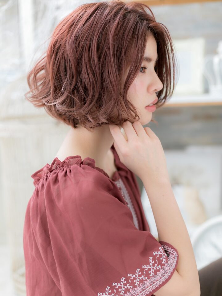くせ毛風カールのフェミニンボブは個性的レッド系カラーでオシャレな髪型に。ナチュラルボブや切りっぱなしボブ、前下がりボブ、マッシュボブ等からのイメチェンに!耳かけも大人かわいい。(メイク担当:北浦和店 棟方)