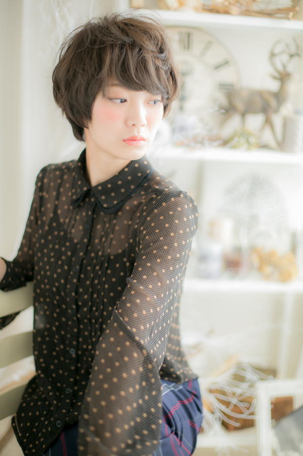 トップの根元をつぶさない様にきをつけてドライ&セット。フェミニンなグレージュショートで無造作でナチュラルな雰囲気に。