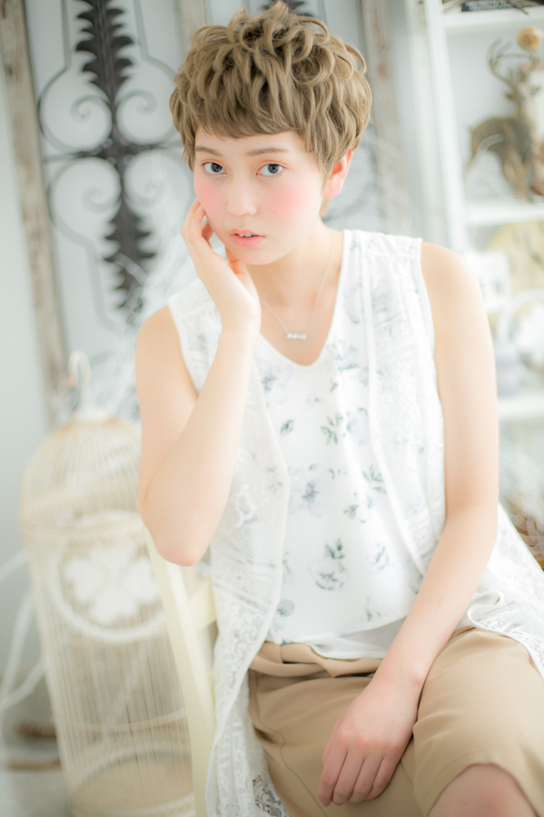短めの前髪とハイトーンカラーで個性が光るショートスタイルです。トップのボリュームで頭の形もよく見えるのでパーマがオススメです。