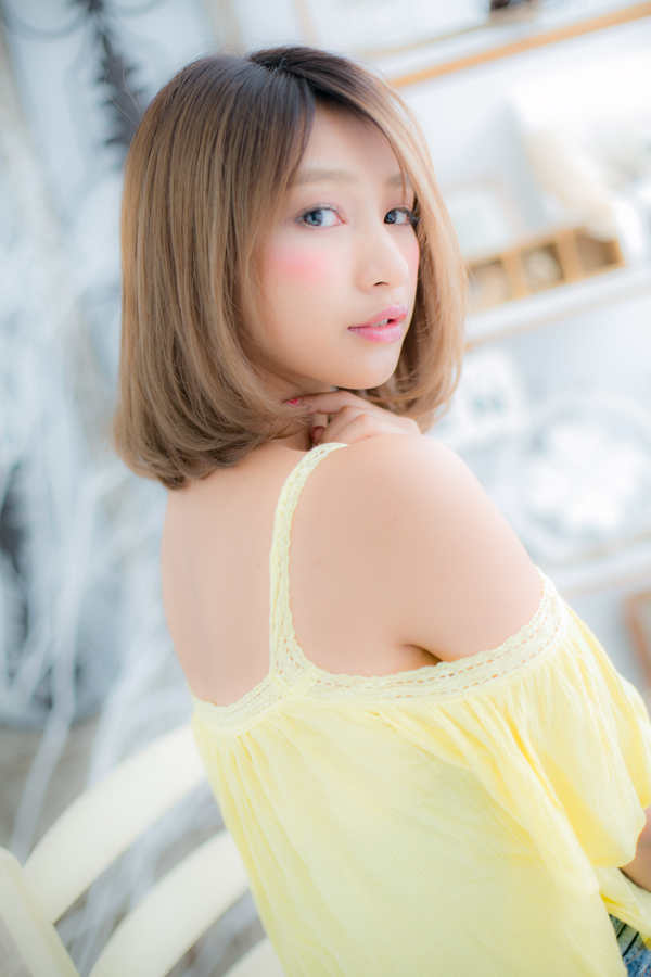 • 大人ハイライト透け感斜めバングマッシュボブ