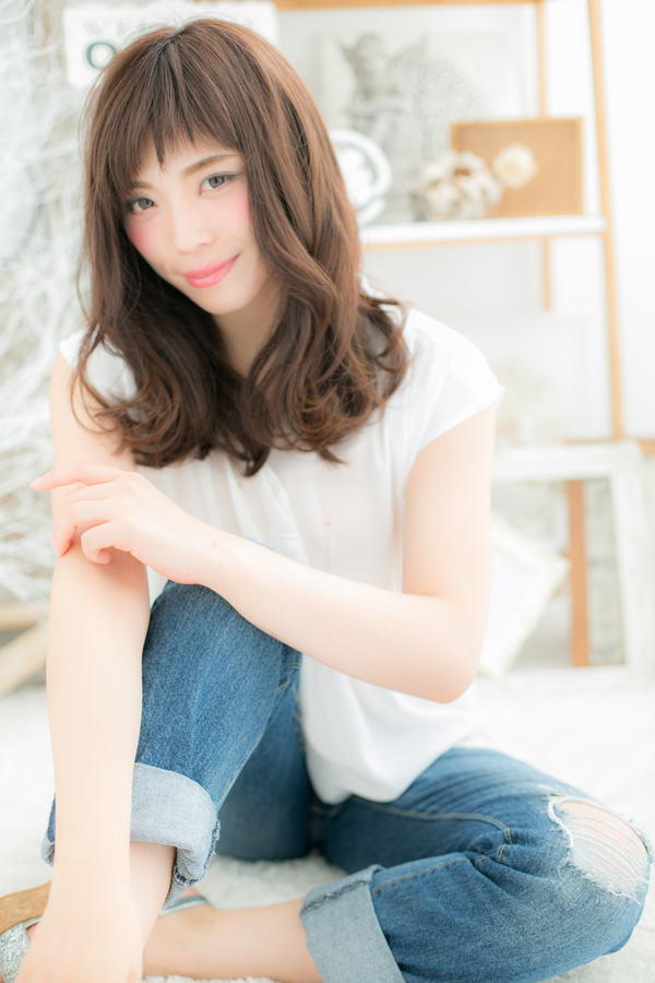 女性らしい緩やかウェーブと落ち着いたブラウンカラーが品良く見せます♪短めの前髪がポイントのアクセントになってカジュアルさもプラスに☆