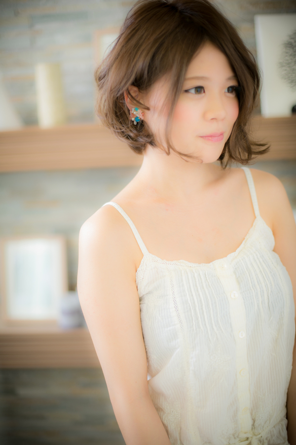 パーマの場合、WAXスプレーで少し崩すだけです。ノンパーマの方は32mmのコテで巻いてWAXで崩します。カールが効いて簡単スタイリングな前下がりボブ。耳かけしてGOOD!