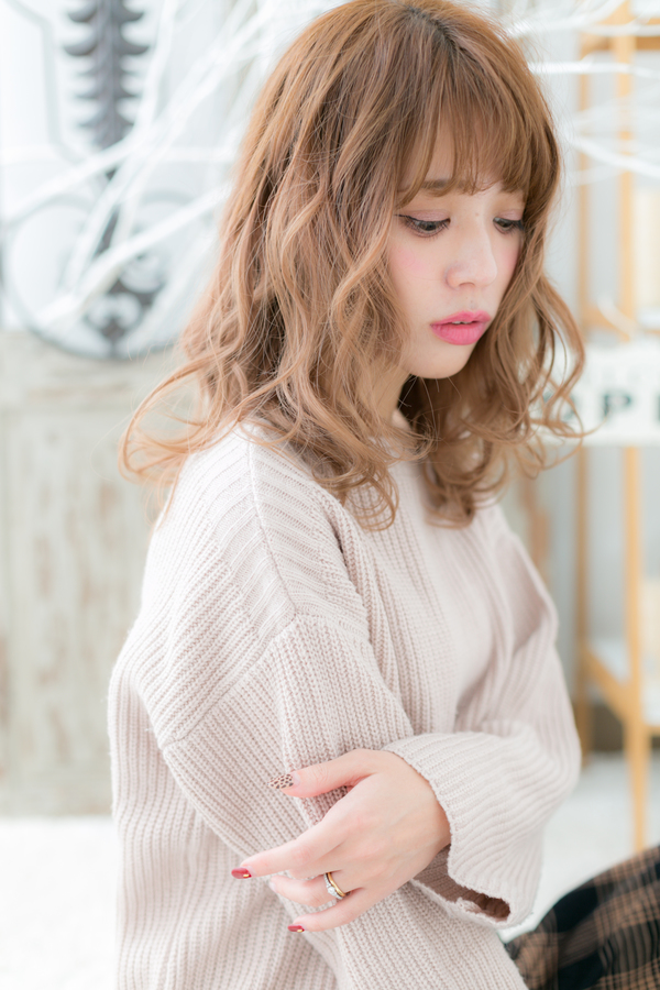 くせ毛風カールでリラクシーに仕上げた色っぽセミディのヘアスタイル。耳かけやラフなヘアアレンジもこなれ感が出て大人女子のファッション度UP。トリートメントしたようなカラーリングで髪の毛の悩みも解決!カラーはアッシュグレーやグレージュ。ブリーチなしもおすすめ!30代・40代にも◎(メイク担当:上尾店 中田)