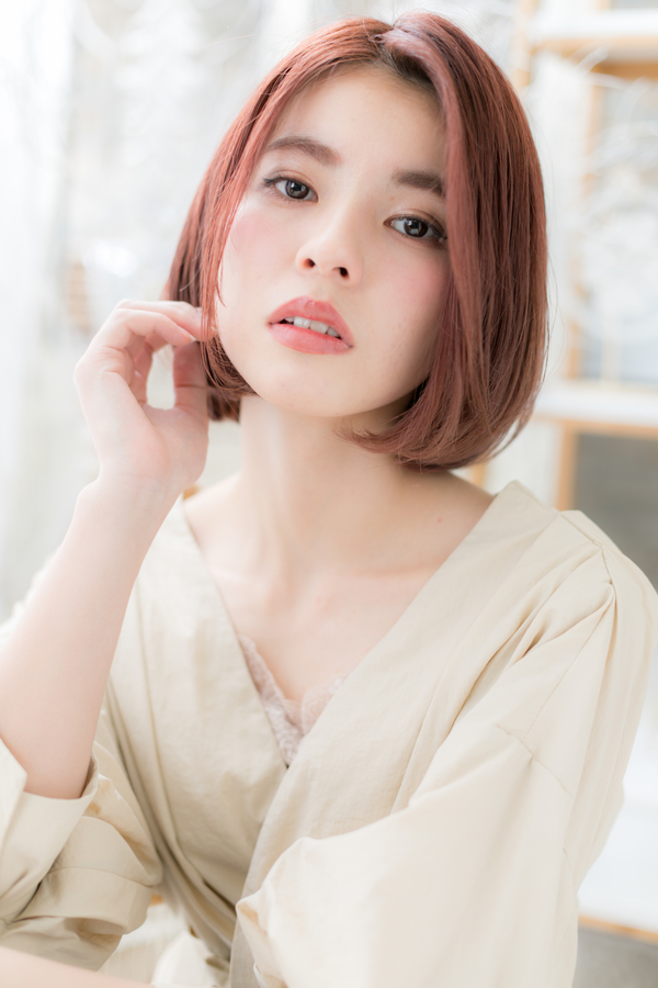 横顔美人の前下がりボブ。個性的カラーでナチュラルボブを一歩リードの大人ボブに格上げ。耳かけしたり、くせ毛風無造作カールで抜け感も大人かわいい。フェミニンボブやふわミディも◎(メイク担当:COVERHAIRGROUP棟方)