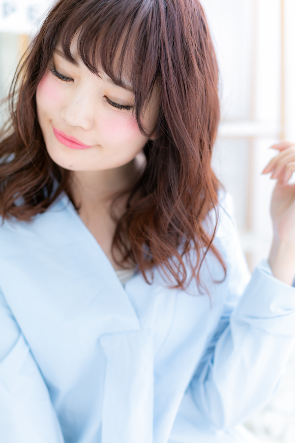 ピンク系カラー&くせ毛風パーマが大人女子の愛されふわミディ。斜めバングや厚めバングで目力UPしたり、前下がりで小顔にしてもGOOD。耳かけや無造作なヘアアレンジもモテスタイル♪30代・40代にもおすすめ!(メイク担当:COVERHAIRGROUP成田)