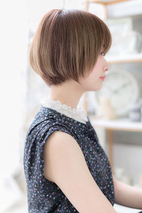 顔周りをタイトに仕上げて小顔に見せたひし形ショート。斜めバングや厚めバングで目力強調。前下がりや耳かけもスッキリ大人女子のファッション度UP。髪の色は暗めのグラデーションやベージュでトリートメントしたようなカラーリングもおすすめ!40代にも人気のヘアスタイルです。