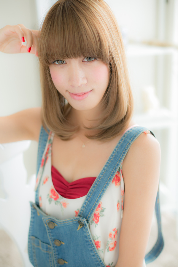 好感度抜群のツヤ重視のストレートミディ。目の上でラウンドカットした厚めバングで目力UP!毛先に極ゆるカールをきかせ,重さの中に軽い質感を。ラブでグラマラスなルミエールカラー,マーメイドアッシュ,ベージュカラーが◎斜めバングやセンターパートも☆