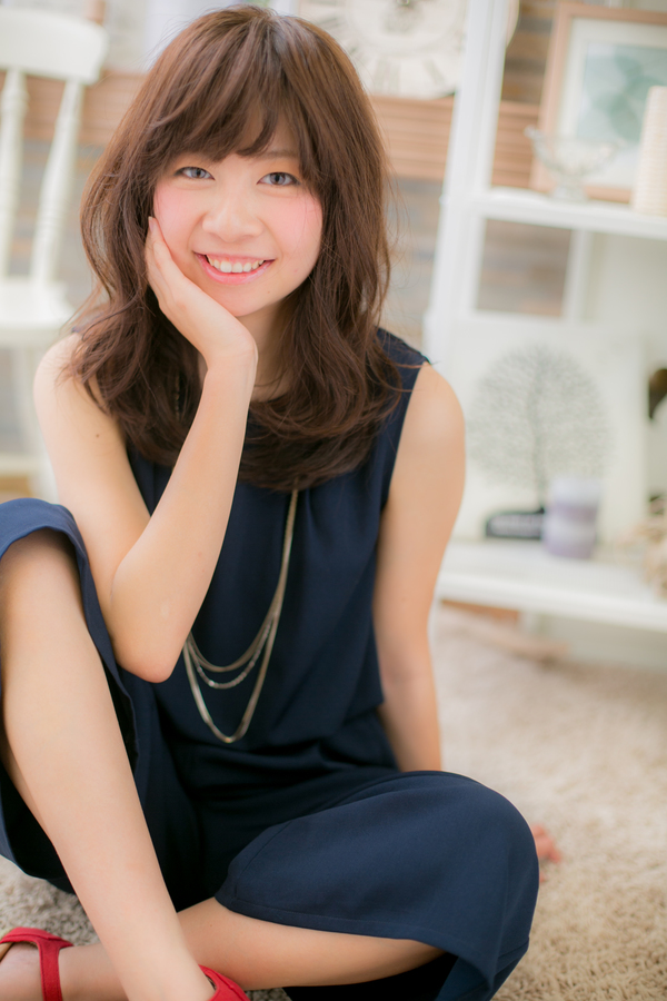 やわらかいカール感のミディアムレイヤースタイル。ゆるくて大きいカール感がやわらかく、ふんわりしたスタイルです。前髪は伸ばしかけでもOKです