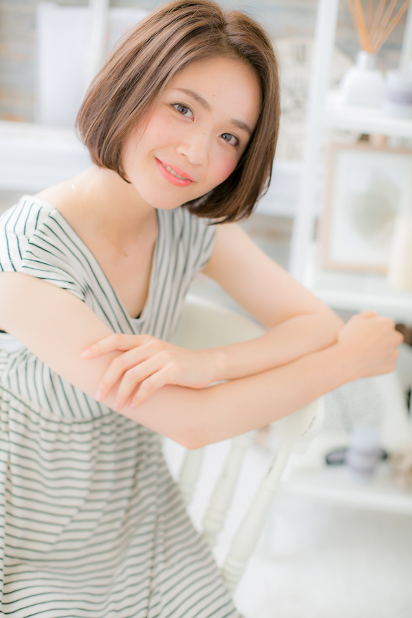大人カワイイショートボブ。前下がりベースになっているので、小顔効果もUP!カラーはトップにハイライトが入っているので、重めのボブでも動きやすさが出てオススメです。
