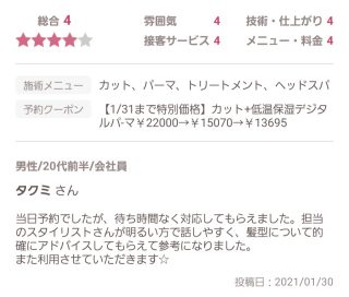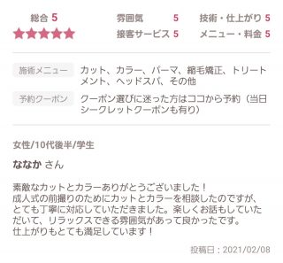 皆様から頂いたお言葉を元に、技術や接客を向上出来るように課題を教えていただき、とても勉強させて頂いております。