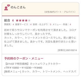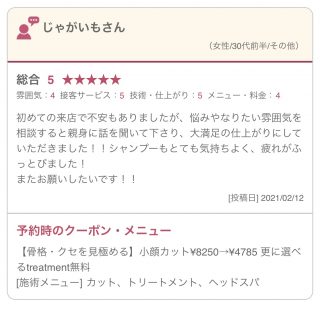 この度は当店を選んで頂きありがとうございました。来店までの不安などあったと思います。お悩みやなりたい雰囲気をしっかり伝えていただきありがとうございました。当店ではお客様に寄り添い、親身なカウンセリングを心がけておりますので、褒めていただき嬉しく思います。シャンプーもお客様の髪質やなりたい質感に合わせて数ある中から選んでおります。シャンプーもスタッフ同士でトレーニングもしておりますので今後も癒しを提供できるように行なっていきます。