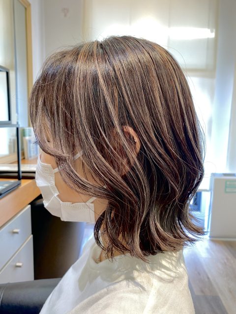 実際顔周りに入れるのにはローライトの方が小顔効果はありますが、トップに高さを出したり、動きが出て見えるようにハイライトを入れることによって高さとボリュームが出るので、顔が小さく見えるという視覚的な効果が生まれます☆