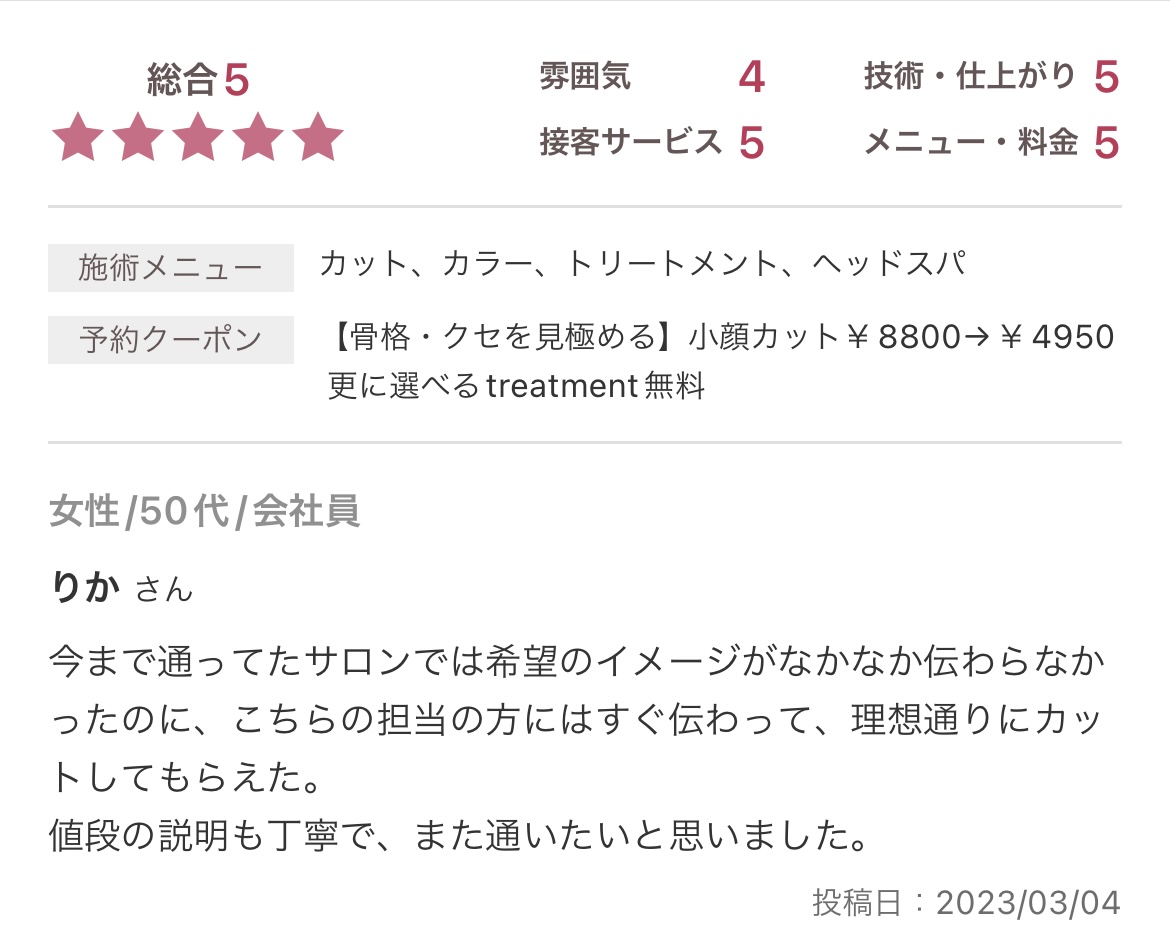 お客様から頂きましたホットペッパービューティの口コミをご紹介させていただきます☆