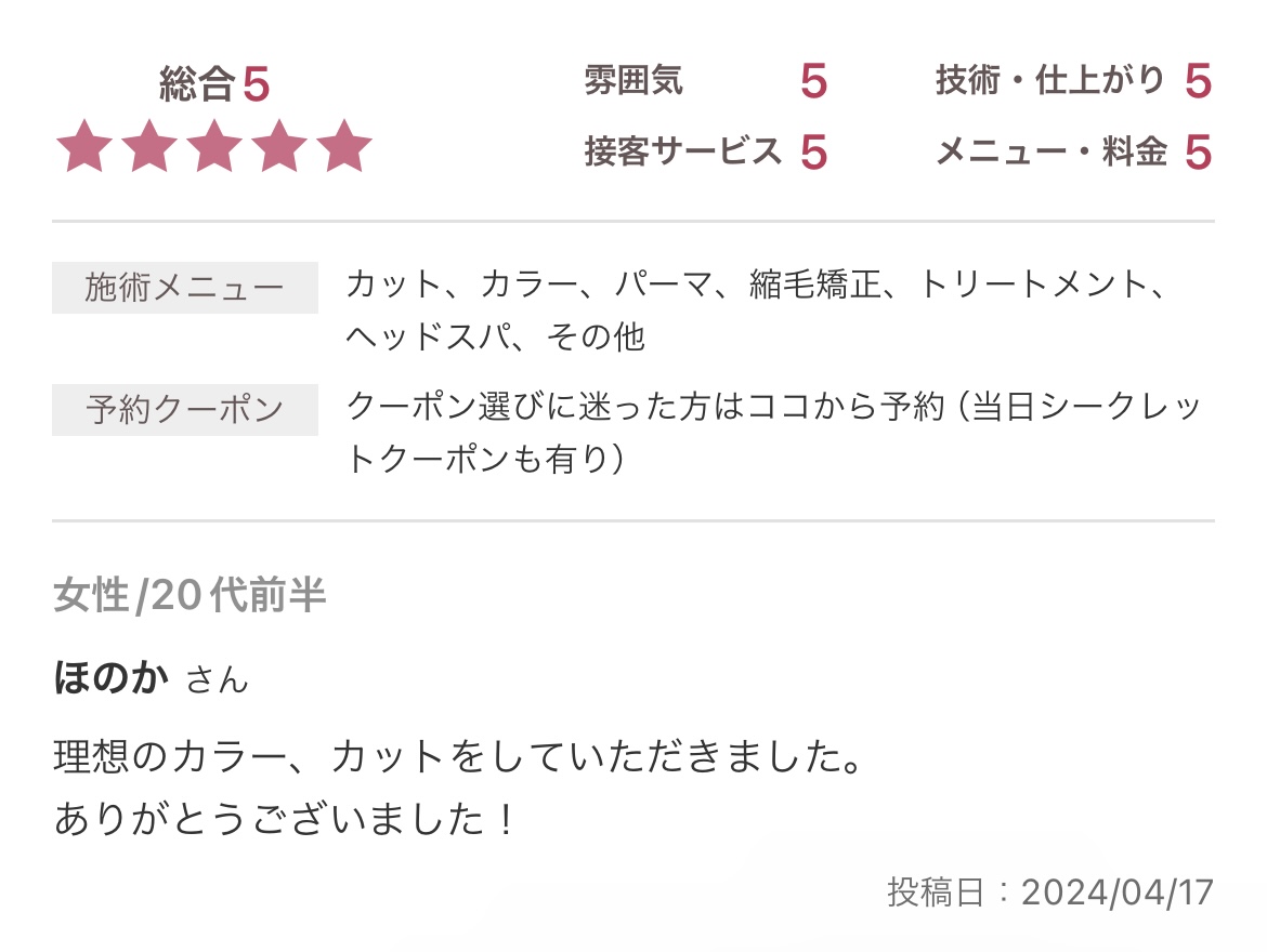 お客様から頂きましたホットペッパービューティの口コミをご紹介させていただきます☆