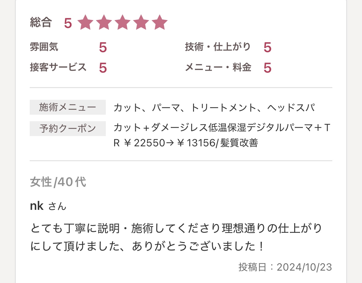 お客様から頂きましたホットペッパービューティの口コミをご紹介させていただきます☆