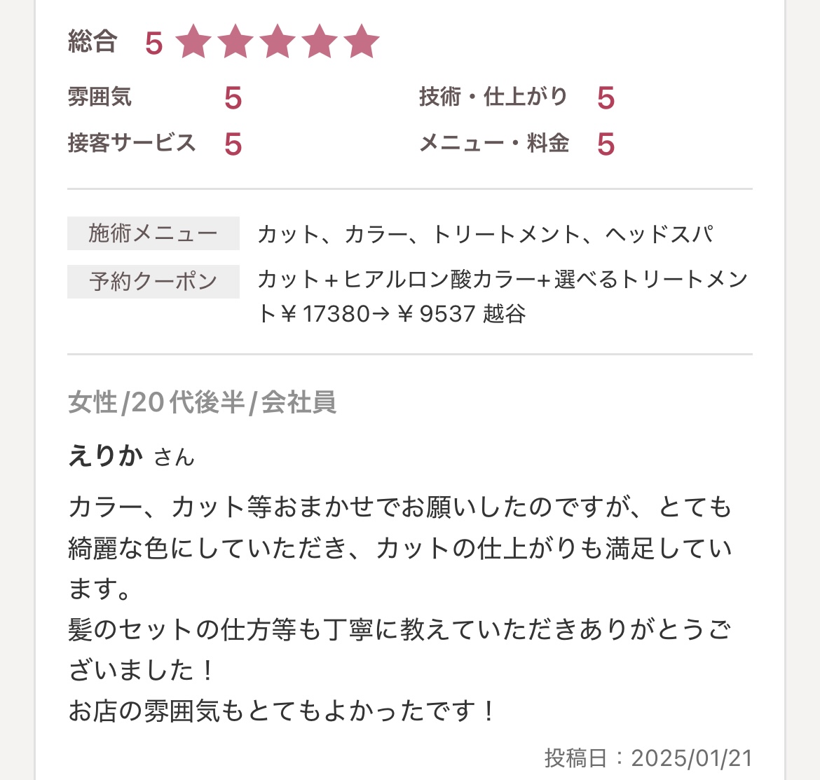 お客様から頂きましたホットペッパービューティの口コミをご紹介させていただきます☆
