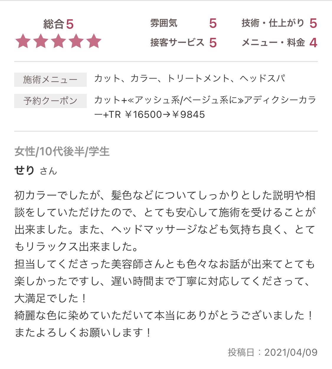 お客様から頂きましたホットペッパービューティの口コミを中心にご紹介させていただきます。