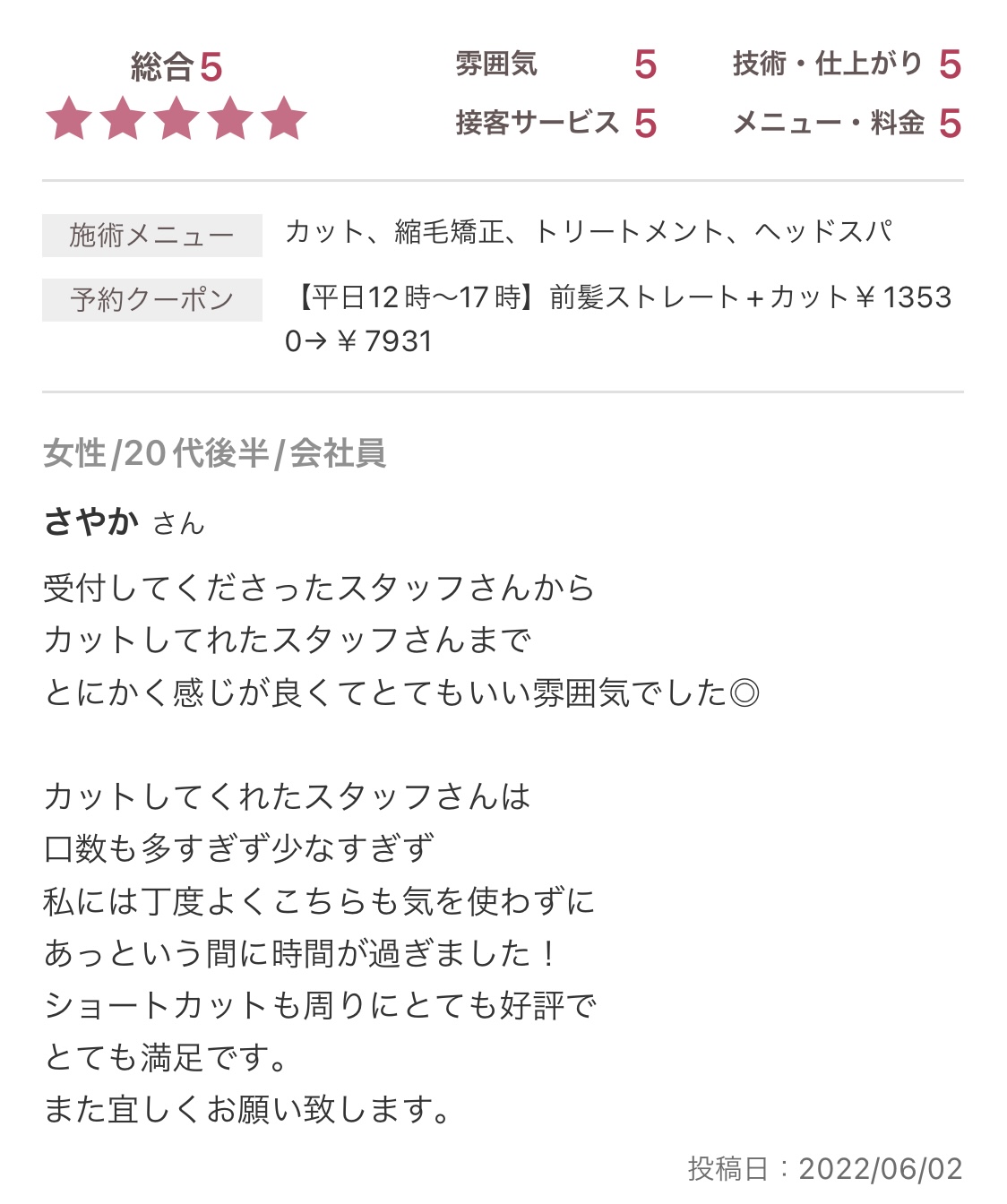 お客様から頂きましたホットペッパービューティの口コミをご紹介させていただきます☆