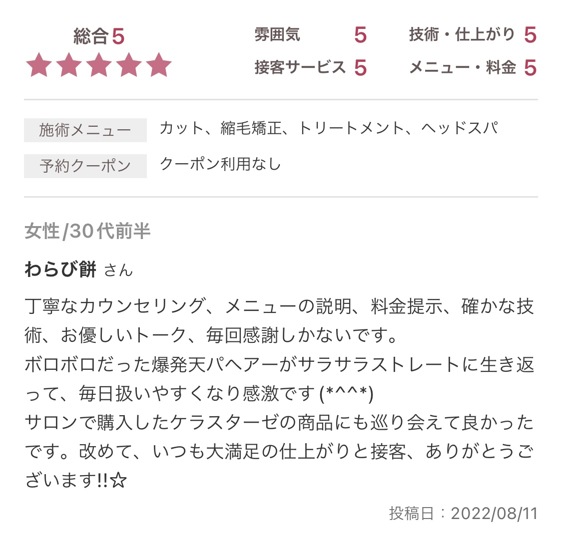 お客様から頂きましたホットペッパービューティの口コミをご紹介させていただきます☆