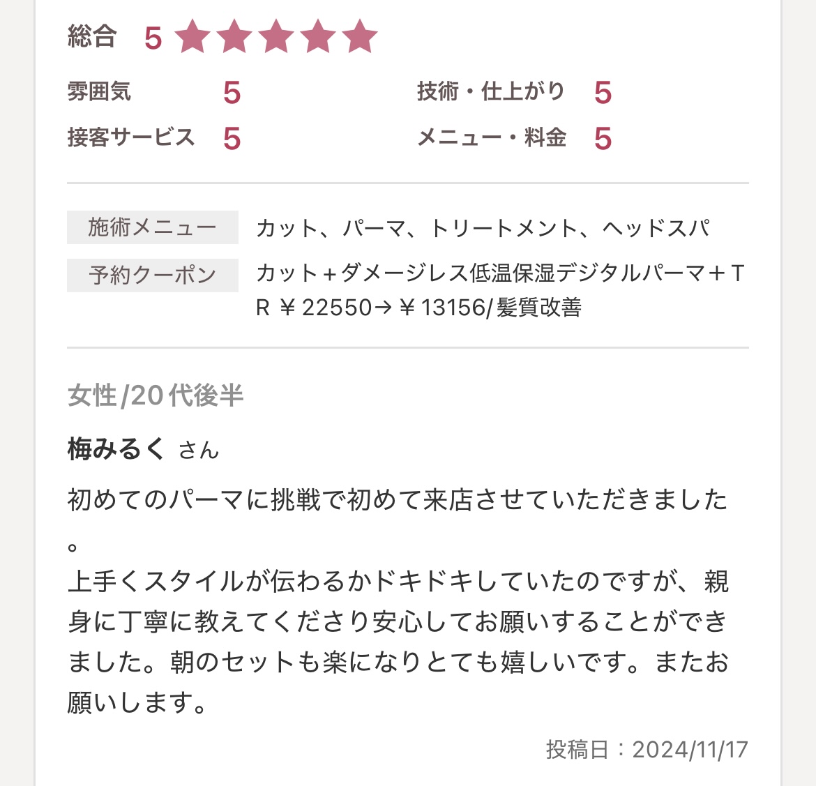 お客様から頂きましたホットペッパービューティの口コミをご紹介させていただきます☆