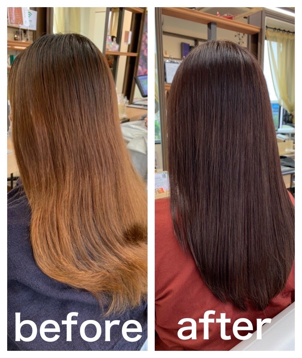髪の弾力と潤いを戻し、色持ちも良くなるので日頃のお手入れもしやすくなります^^
