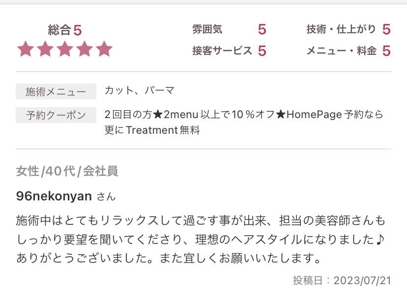 お客様から頂きましたホットペッパービューティの口コミをご紹介させていただきます☆