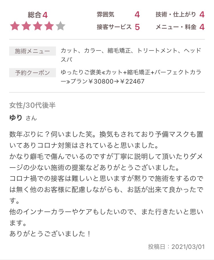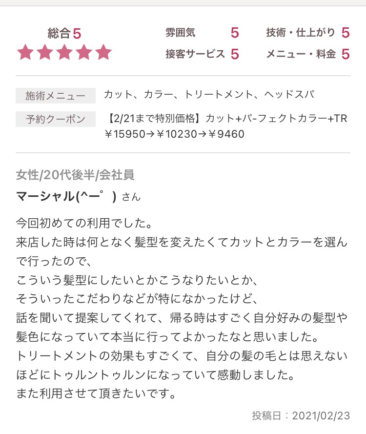 技術面、接客面、サロン内の雰囲気やメニューについて、コロナ対策についてなど