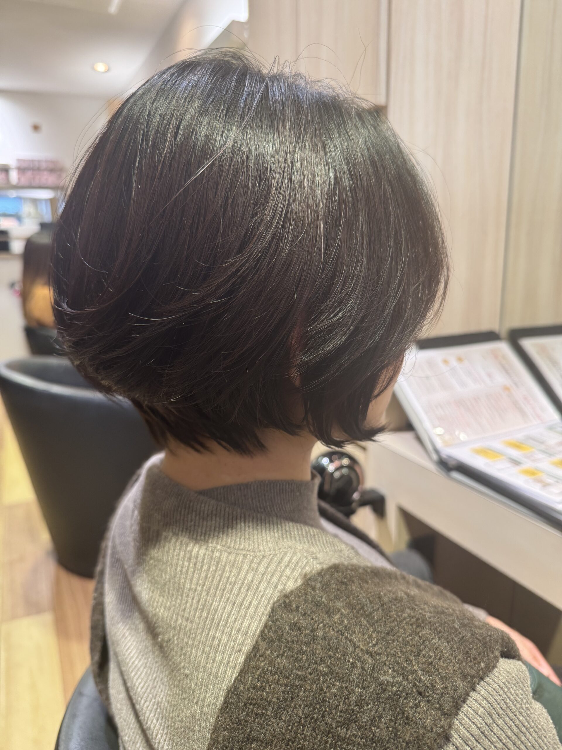 今回のお客様は、襟足ギリギリの長さで、サイドは顎ラインのショートボブスタイルです。