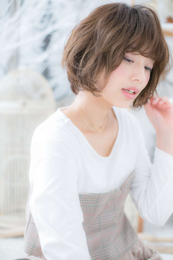 シースルーバングと毛先の無造作パーマでフェミニンに仕上げたくせ毛風ゆるふわミディ。耳かけも大人かわいい。ナチュラルボブやフェミニンボブ、大人ボブや前下がりボブからのイメチェンにオススメのモテ髪型です。