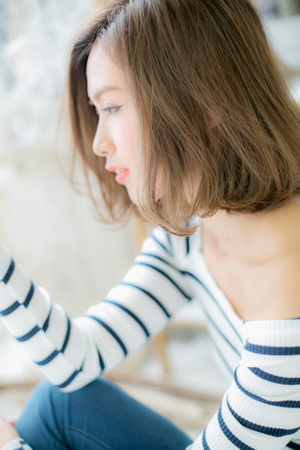 スタイリングが苦手な方でモセットできるように、ベースにパーマをかけているので、朝はワックスのみでOKの簡単スタイリング。頬にかかるサイドの毛流れでフェイスラインをカモフラージュして小顔に見せます。耳かけもOK。