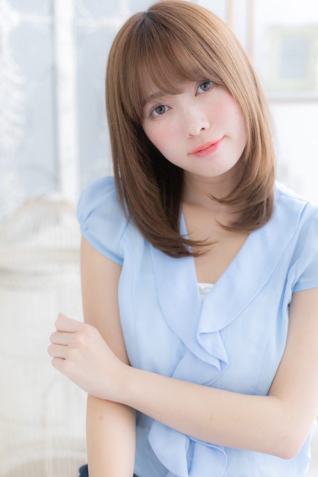 前下がりで輪郭カバーして小顔にメイクしたワンカールセミディのヘアスタイルで大人女子のファッション度UP。ミディアムヘアを際立たせるグラデーションやベージュの暗めの髪の色もおすすめ!(メイク担当:COVERHAIRGROUP 成田)
