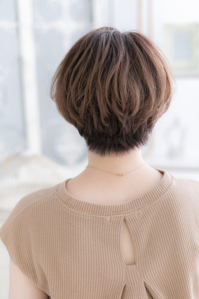 前下がりボブにくせ毛風カールをオン。ニュアンス感ある動きをつけて大人女子のファッション度。ナチュラルボブや大人ボブも大人かわいい。耳かけや前下がりで小顔見せもGOOD。(メイク担当:北浦和店 棟方)