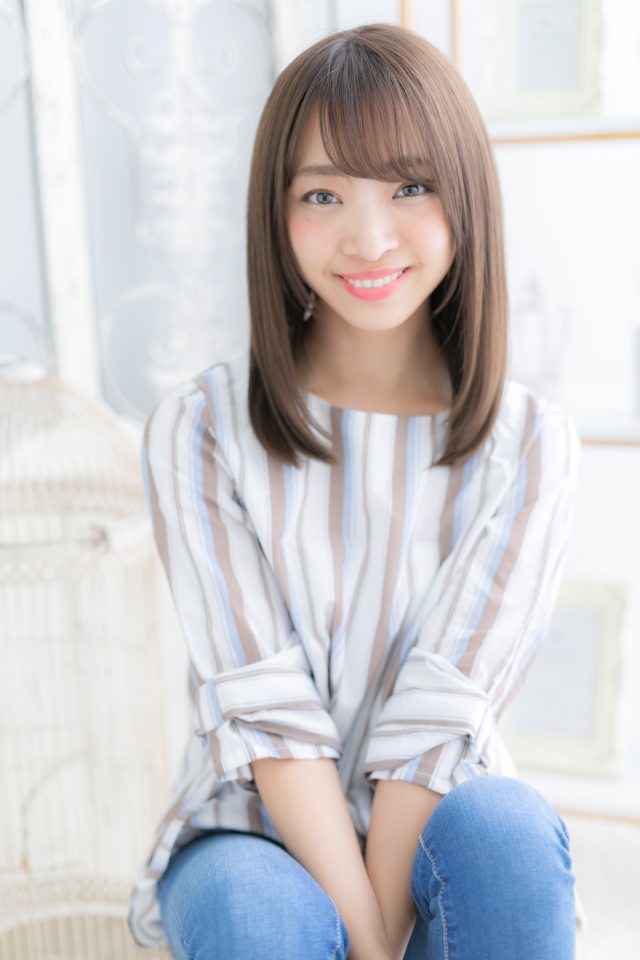 シンプルなナチュラルミディはツヤと透明感がポイント。ミディアムヘアを際立たせるベージュカラーやグラデーションカラーもおすすめ。耳かけや前下がりも大人女子のファッション度UP。(メイク担当:北浦和店 棟方)