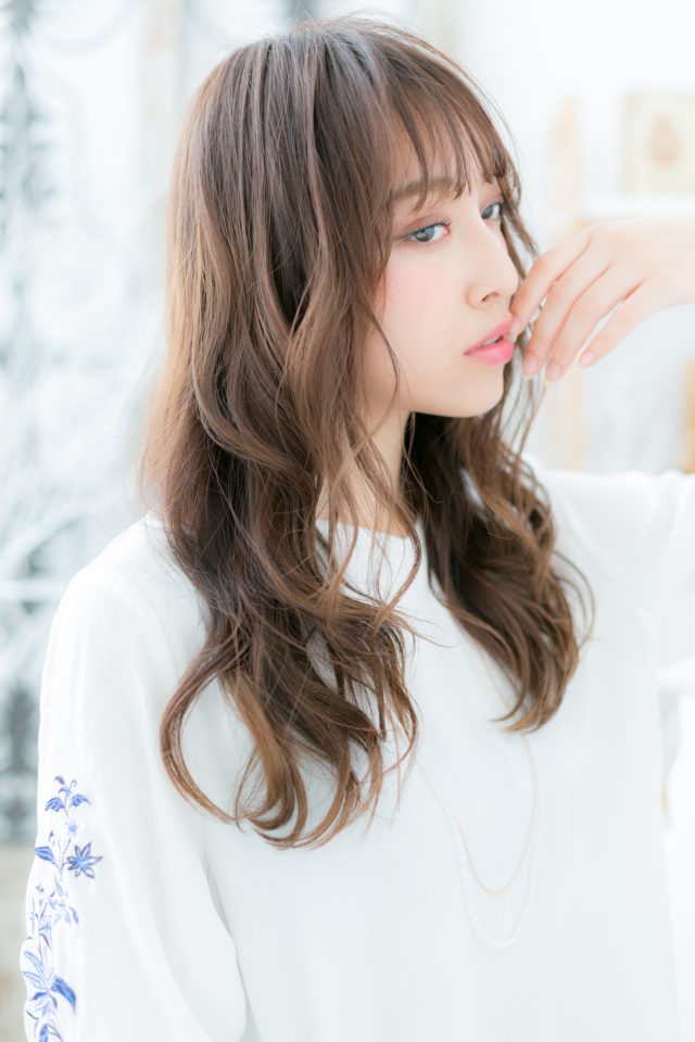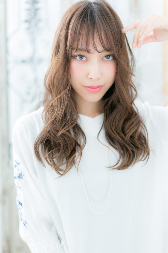 透け感ある斜めバングにボリュームカールでグラマラスなレディのヘアスタイルで大人女子のファッション度UP。結婚式や二次会でも映えます。くせ毛風パーマで抜け感を出したり、大人かわいい耳かけ・ふわミディも◎トリートメントしたようなカラーリングで髪の毛の悩みも解決!30代・40代にもおすすめ!(メイク担当:COVERHAIRGROUP 棟方)