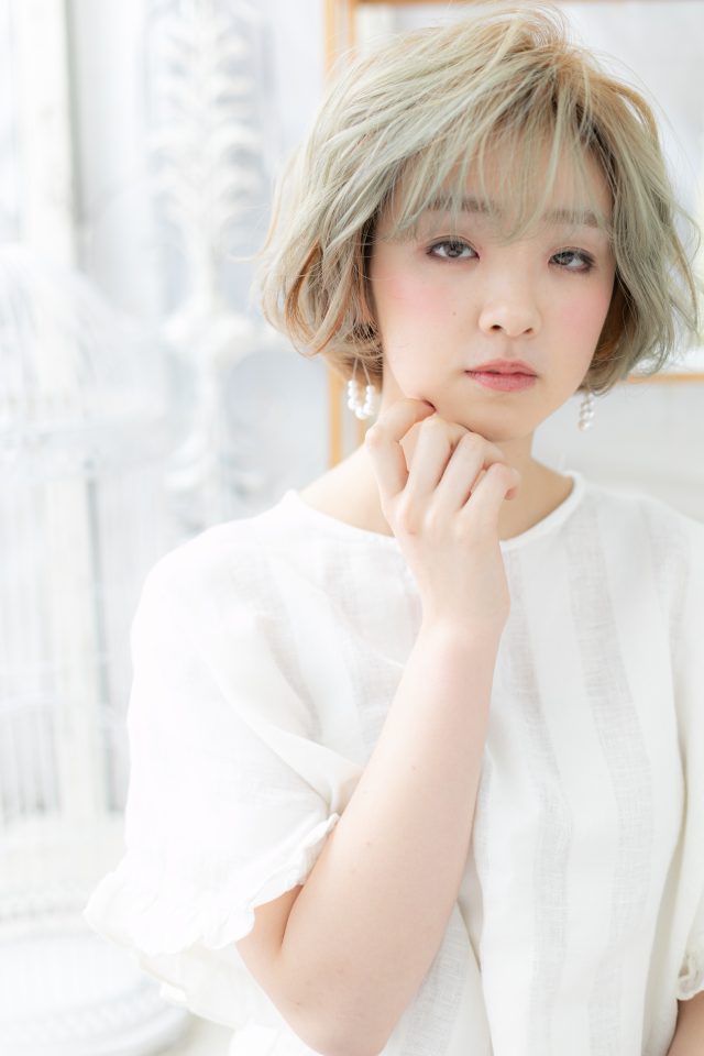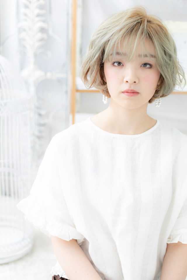 肩上でハネにくいくせ毛風ラフボブはハイトーンで周囲と差を。パーマでまとまり感ある朝楽ボブに。ナチュラルボブやフェミニンボブ、大人ボブや前下がりボブからのイメチェンにGOOD。(メイク担当:COVERHAIRGROUP岩淵)
