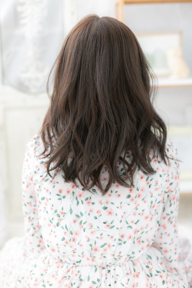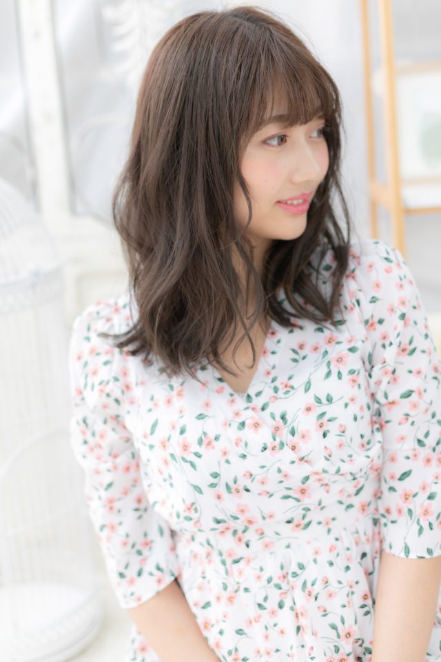 斜めバングのくせ毛風ゆるふわミディのモテスタイルで大人女子のファッション度UP。ローライトやダークカラーで落ち着いた印象にすれば甘すぎない大人かわいいヘアスタイル30代・40代にも◎(メイク担当:COVERHAIRGROUP棟方)