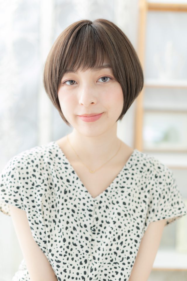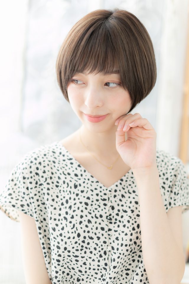 短めの斜めバングと前下がりでコンパクトにまとめた大人かわいいナチュラルボブショート。オフィスでもOKの好感度大スタイルで大人女子のファッション度UP。トリートメントしたようなカラーリングもおすすめ!30代・40代にも◎