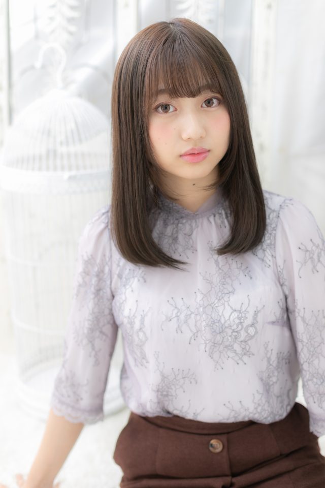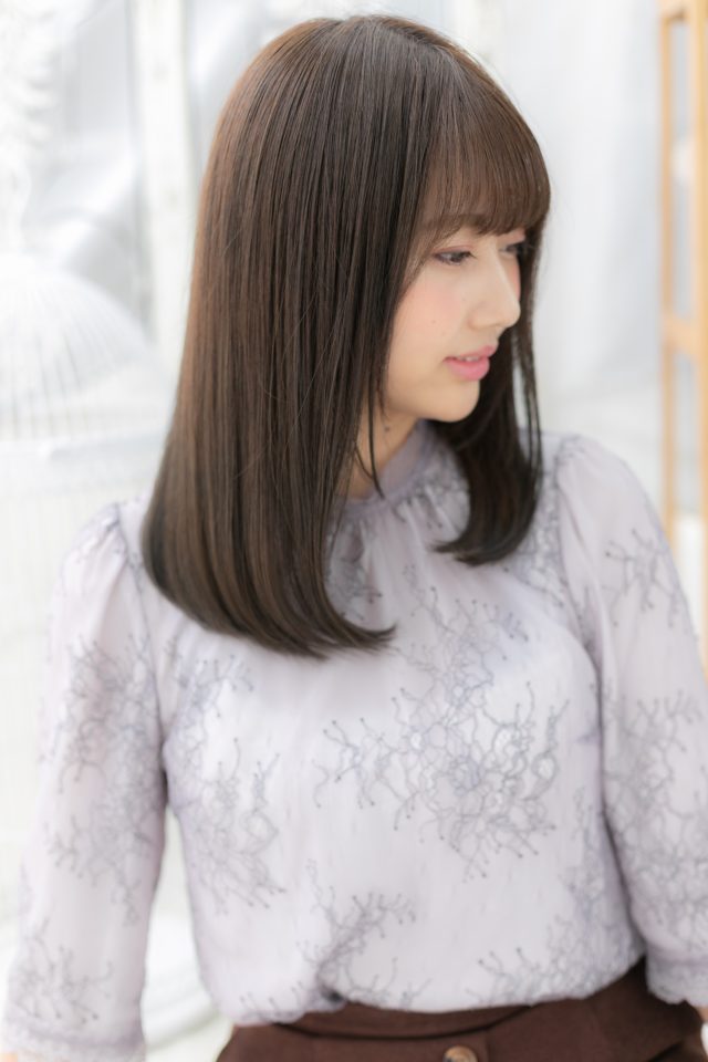 ノームコアなナチュラルミディはレイヤーカットとシースルーバングで軽さと透明感を演出。黒髪ダークカラー、ローライトでも重くなりません。斜めバングや厚めバングで目力UPしてもOK。(メイク担当:北浦和店 棟方)
