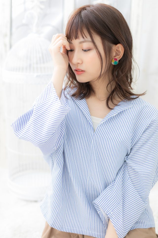 オン眉でガーリーに仕上げたゆるふわミディ。毛先パーマでエアリーに仕上げれば黒髪やローライトでも重くなりません。前下がりで小顔見せ。斜めバングや厚めバングで目力UPも大人かわいい。(メイク担当:川口店 成田)