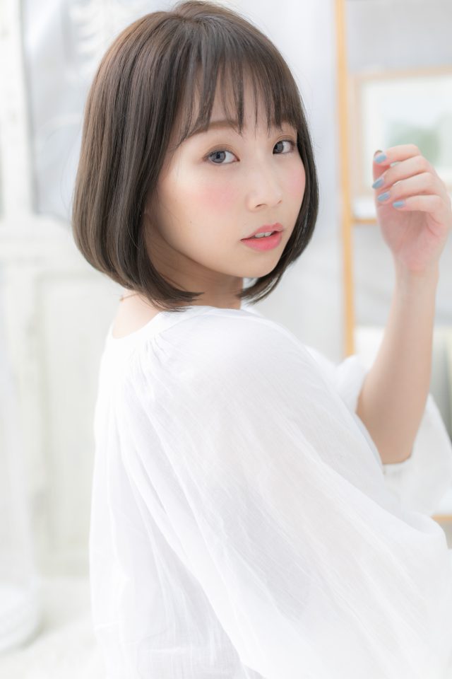 シンプルな黒髪ナチュラルボブは、シースルーバングとレイヤーカットで軽さとニュアンス感ある動きで大人女子のコーデを完成。40代のエラ張り対策にもおすすめ!(メイク担当:北浦和店棟方)