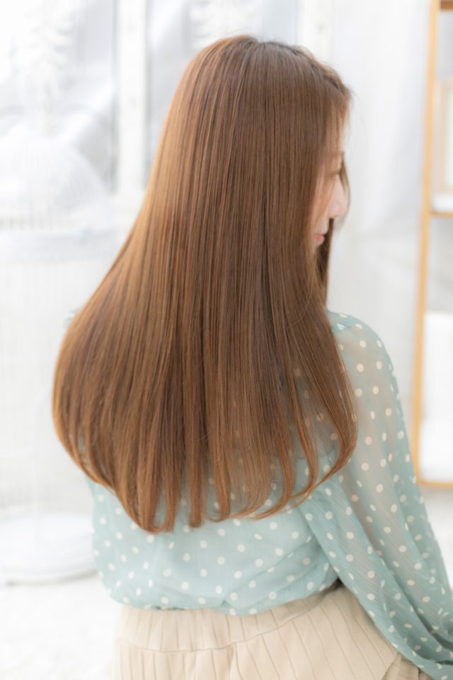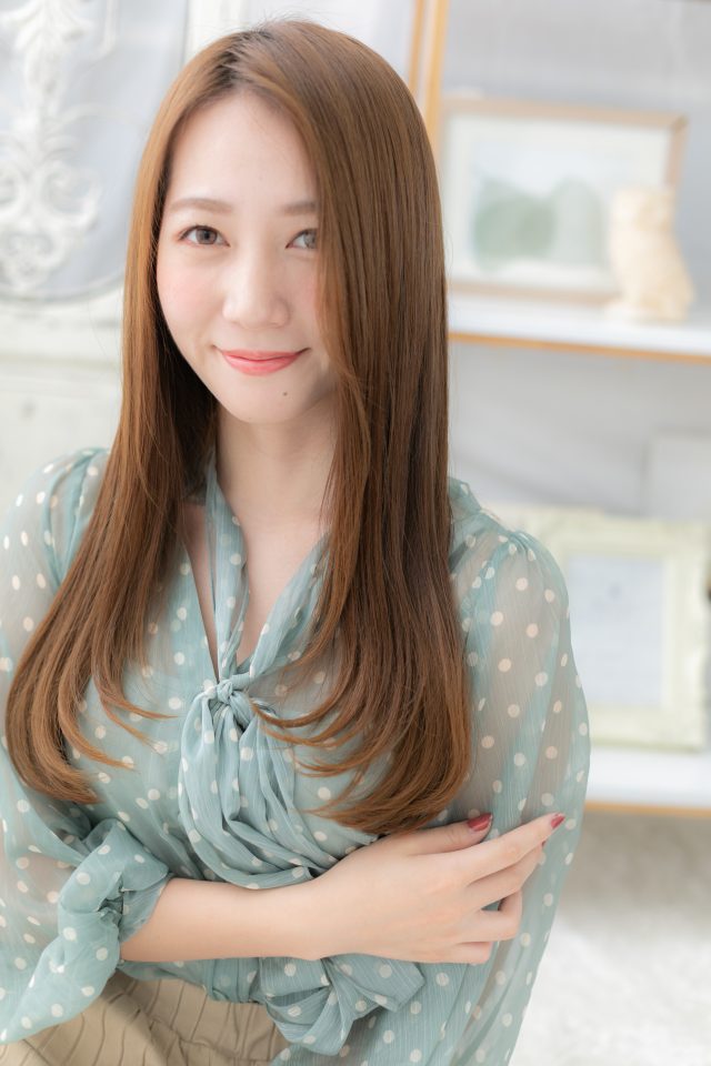 重めスタイルになりがちなストレートロングは、ツヤ感ブラウンベージュカラーで透明感UPで大人女子のコーデを完成。トリートメントしたようなカラーリングで髪の毛の悩みも解決。人気のカラーもおすすめ!(メイク担当:川口店成田