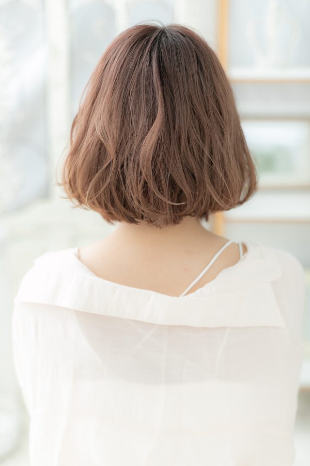 くせ毛風Aラインシルエットで大人かわいい印象に仕上げたゆるふわミディ。前下がりで小顔見せ効果。ピンクブラウンやラベンダーベージュでフェミニンに。耳かけしたり、斜めバングや厚めバングで目力UPにイメチェンも◎