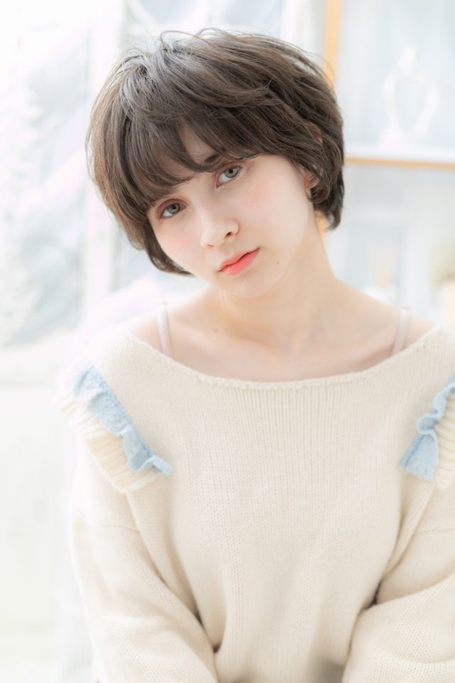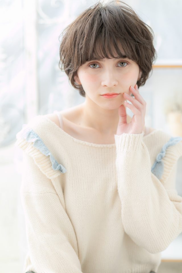 ボーイッシュに見えがちなマッシュショートをガーリーにヘアアレンジした大人ショートで大人女子のコーデも完成くせ毛風ニュアンスカールで動きを出し黒髪風ダークカラーでシックなヘアスタイル。30代・40代にもおすすめ!(メイク担当:COVERHAIRGROUP中田)